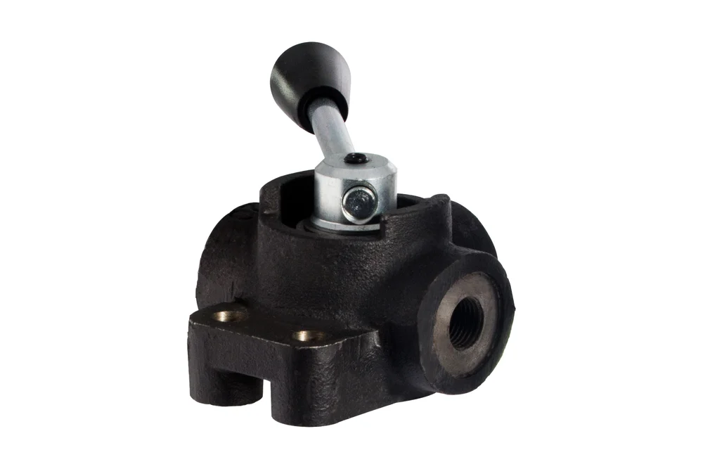 Three-way switching valve, normally closed, used in hydraulic systems to control the direction of the working fluid flow. Control is performed using a manual lever. Material: cast iron (body), hardened steel (stem). Sealing: NBR. Operating temperature: from -20°C to +90°C.