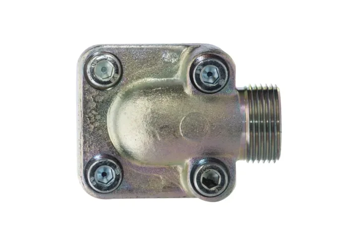 90° flange connection with a compact design, featuring a flange with a pitch diameter of holes from 35 mm to 55 mm, with an external metric connection thread, socket 24° DIN 2353. Used in hydraulic pump connections. Standardly equipped with a set of screws, washers, and an O-ring. Material: carbon steel, galvanized. Operating temperature: from -20°C to +100°C.
