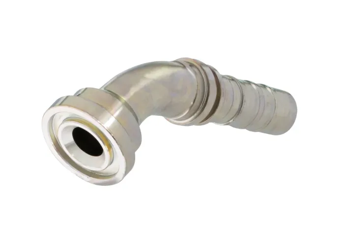 45° NON SKIVE SAE 3000 flange end (SFL 45), lightweight series, designed for crimping in hoses type 4SP, 4SH, R13, and R15 using TI-N crimping sleeve… Installation: without cutting the hose rubber. Material: carbon steel, galvanized.