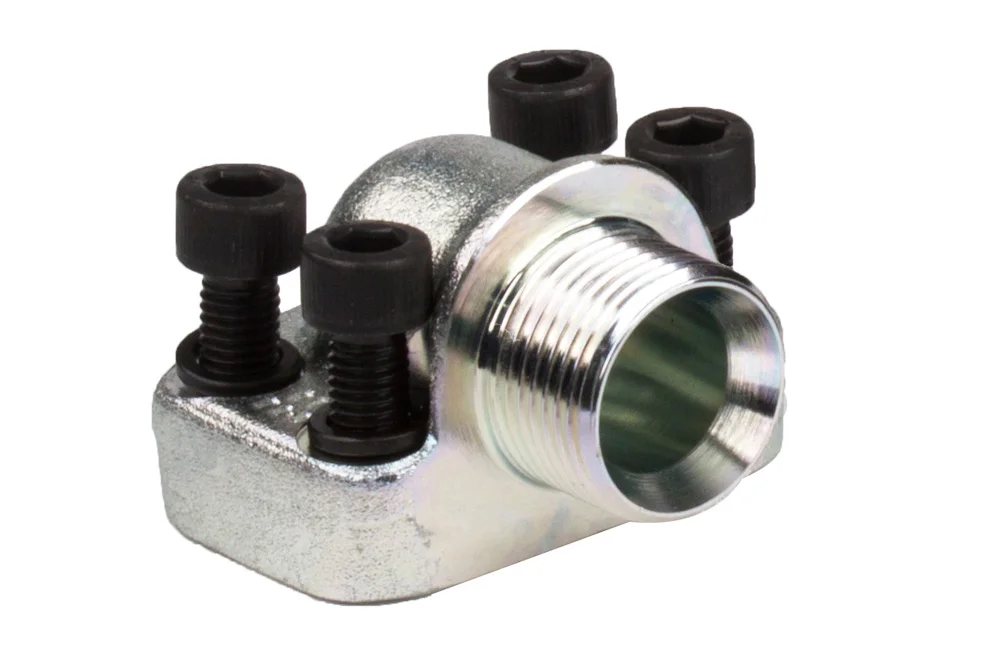 90° SAE 6000 flange connection with a compact design and external BSP thread for use in hydraulic systems. Supplied with mounting screws and an o-ring seal (NBR). Material: carbon steel, galvanized. Operating temperature: from -20°C to +100°C.
