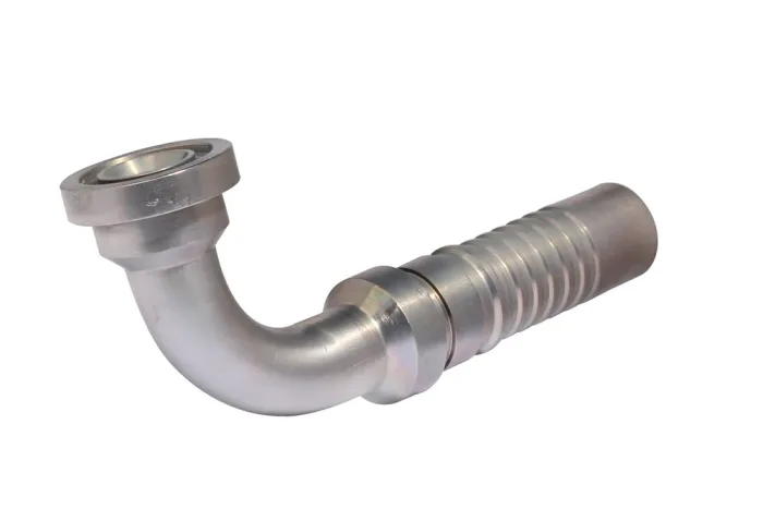 90° INTERLOCK SAE 6000 flange end, O-ring seal or other gasket in the flange groove, for hose types 4SH, R13, and R15. Material: carbon steel, galvanized.