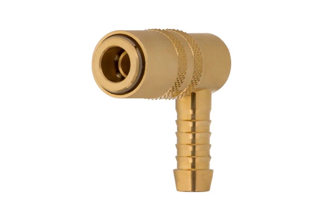 90° quick coupling socket DYROS series 6 with hose end without valve. Designed for cooling liquids for molds in plastic processing, compressed air installations, gas cylinders, and other technical fields. Material: all components are made of brass, while the retaining rings, springs, and balls are made of treated stainless steel. Sealing: viton. Working pressure: 15 bar.