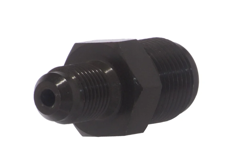 Adapter with external BSP thread (seal on external cone 120°) and external UNF thread (seal on external cone 60°) allowing the connection of quick couplings and UHP hoses to each other, as well as connecting them to UHP connection blocks. Material: black galvanized steel. Working pressure: 3000 bar.
