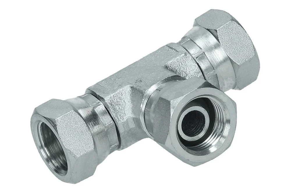 Adaptor – high-pressure tee type A117 with internal BSP threads, with swivel nuts (60° cone sealing). Material: carbon steel, galvanized.