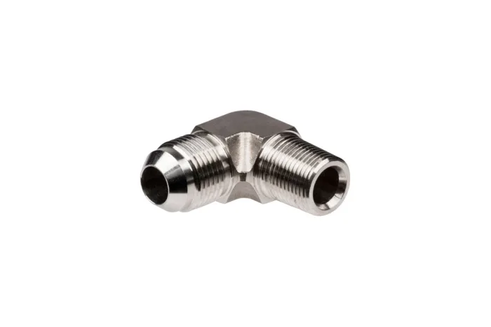 Adjustable 90° elbow fitting JIC 37° with external BSPT thread (seal on the thread – with Teflon tape or anaerobic sealant). Material: AISI 316 steel.