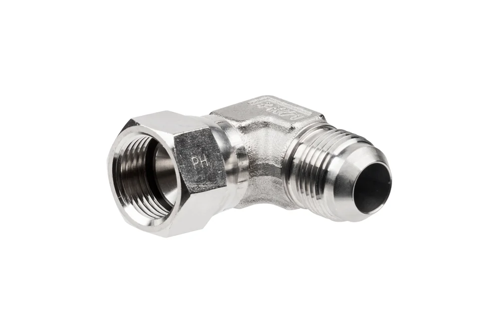 Adjustable 90° JIC 37° fitting with external thread and internal UNF thread, nut (seal on 37° cone). Material: AISI 316 steel.