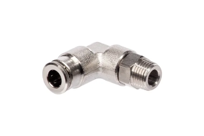 Adjustable 90° push-in connector for hose with external BSPT or metric thread. For use in lubrication technology. Recommended material for connected hoses is polyamide. Body material: nickel-plated brass. Sealing material: o-ring (HNBR). Operating temperature: from -30°C to +150°C. Maximum working pressure: 150 bar (for liquids), 30 bar (for air).