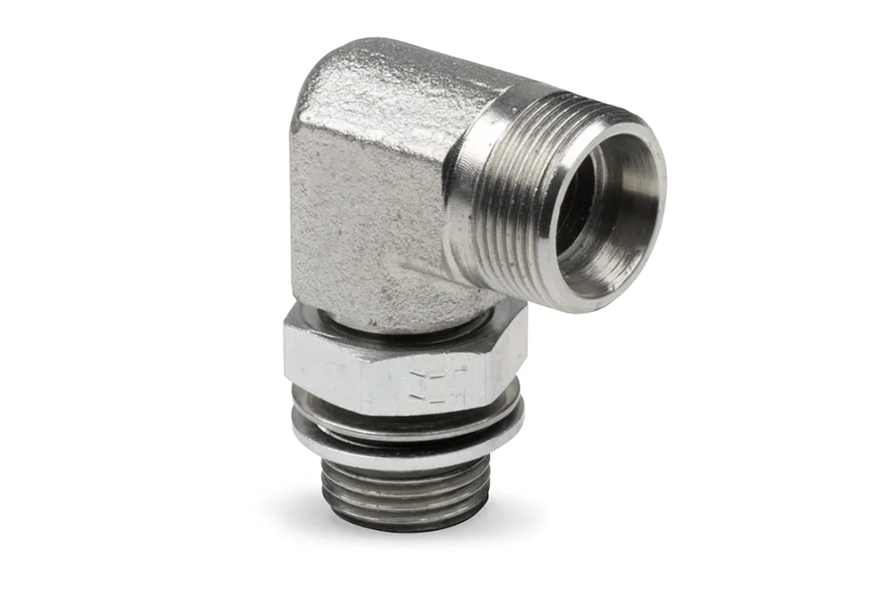 Adjustable angled screw connection DIN 2353, type WE-BG: 24° DIN 2353 socket with external metric thread and external BSP thread (sealing ISO-1179 type G – O-ring with retaining ring). Safety factor 4:1. Available as: L (light series), S (heavy series). Material: stainless steel.