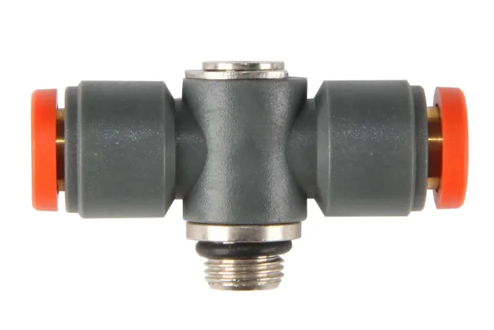 Adjustable “T” plug connector with external thread, type R 20/A, intended for connecting wires and other components in pneumatic systems. Easy and quick to use for multiple assemblies without loss of sealing on the mechanical and pneumatic sides. Material: nickel-plated brass. Working pressure: 16 bar. Working medium: vacuum, air. Operating temperature: from -20°C to +80°C. Sealing: NBR.
