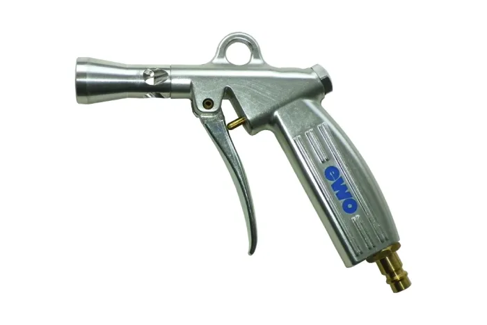 High-quality aluminum compressed air gun designed for removing all types of contaminants from surfaces: liquids, fine chips, shavings, etc. Flow regulation by lever pressure. Made of forged aluminum, protected by anodizing, ensuring high strength, durability, and corrosion resistance. Ideal for use even in harsh working conditions. The gun is equipped with a FULL-JET nozzle with a diameter of 2.5 mm, interchangeable, with an external connection thread M12x1.25, which features a significantly wider air stream and greater power at a pressure of 2 bar, compared to a standard nozzle with a hole diameter of 1.5 mm. Other nozzles can be installed instead of the FULL-JET – see EWO gun accessories. Depending on the connection, the gun is available with a EUROSTANDARD 7.2 plug or a hose coupling with diameters of 6 mm, 9 mm, and 13 mm. Material: aluminum (forging). Nozzle hole diameter: 2.5 mm. Operating pressure: 2 ÷ 8 bar. Operating temperature: from -10°C to +50°C.
