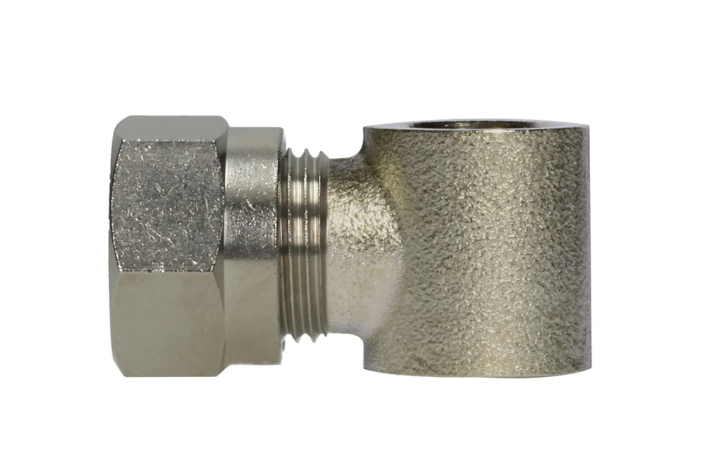 Angle body of BANJO coupling with locking ring type D17. Through bolts for the body: D7, D8, D9, D10. Material: nickel-plated brass. Working pressure: 18 bar.