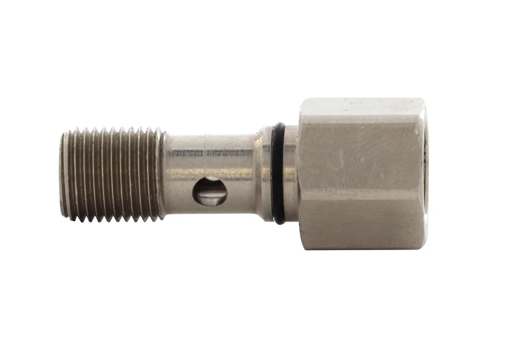 BANJO screw with O-ring and internal thread type D9 for couplings type R28, R29. Material: nickel-plated brass. Working pressure: 18 bar.