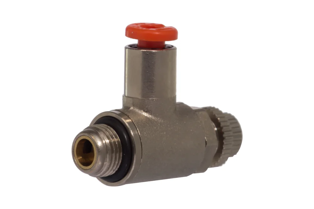 MRF NMB type throttling valve series COMPACT “N” used for simultaneous flow regulation in both directions – during filling and venting, applied in pneumatic systems for regulating the flow rate of compressed air and flow direction. Equipped with a plug-in connection for easy disassembly of pneumatic hoses. Adjustment change via a control knob and/or screwdriver; possibility of securing the setting with a locking nut. Size: M5, 1/8″, 1/4″, 3/8″, 1/2″. Working pressure: up to 10 bar. Operating temperature: from -10°C to +70°C. Material: nickel-plated brass.