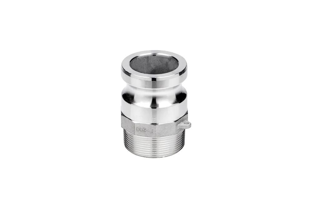 CAMLOCK F connector plug with external BSPT or NPT thread made according to the American military standard MIL-C-27487 (A-A-59326), commonly used as a transfer connection, particularly in the petrochemical industry. Working pressure: up to 10 bar, depending on the size of the connector. Material: aluminum.