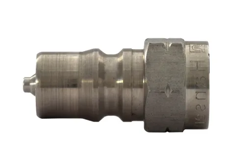 Non-drip flat-face quick coupling plug designed mainly for construction machinery where large pressure spikes occur. The plugs are also available in a version with a static pressure eliminator. The quick coupling can be operated with one hand. Depending on the application, the appropriate sealing material should be selected. Interchangeable with ISO-F quick couplings from other manufacturers. Standard: ISO 16028, excluding size 3/16″. Application: hydraulic power (hydraulic oil), industrial. Material: steel with zinc-nickel coating, except for size 3/16″ which is coated with zinc. Working pressure: up to 720 bar. Sealing: NBR (from -25°C to +100°C), viton (from -15°C to +200°C).