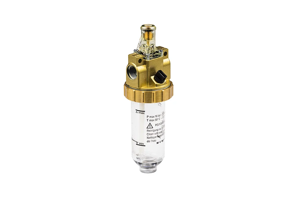 Compressed air lubricator with polycarbonate tank, ensures proper lubrication of devices in pneumatic installations with oil mist. Size: DN6. Installation: vertical. Housing material: brass. Sealing: NBR. Tank capacity: 40 cm³. Supply pressure: up to 16 bar. Operating temperature: from -10°C to +50°C. Connection: G 1/4″ BSP. Flow rate: 1160 l/min (at inlet pressure 6 bar Δp = 1 bar). Weight: 400 g.
