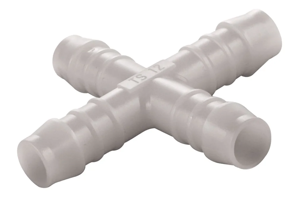 Tee fitting for connecting hoses type NA. Designed for use in control systems, in installations for transporting gases and liquids, in vacuum systems, etc. Working pressure: up to 10 bar. Material: acetal copolymer (POM).