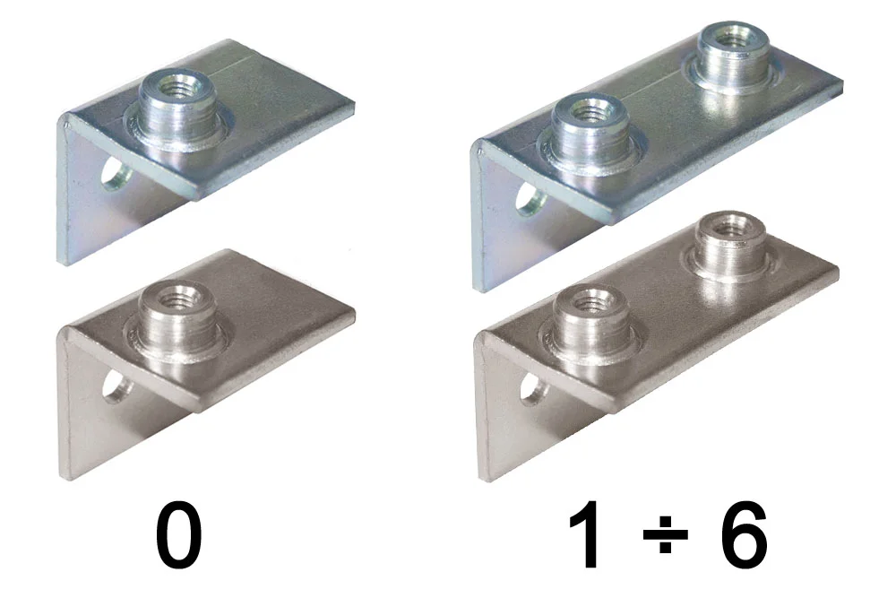 Corner lower plate for mounting DIN 3015 standard clamp type 100/101. For size group 0, there is one hole for a screw. For size group 1 to 6, there are two holes for screws. Material: carbon steel, galvanized or AISI 316L steel.