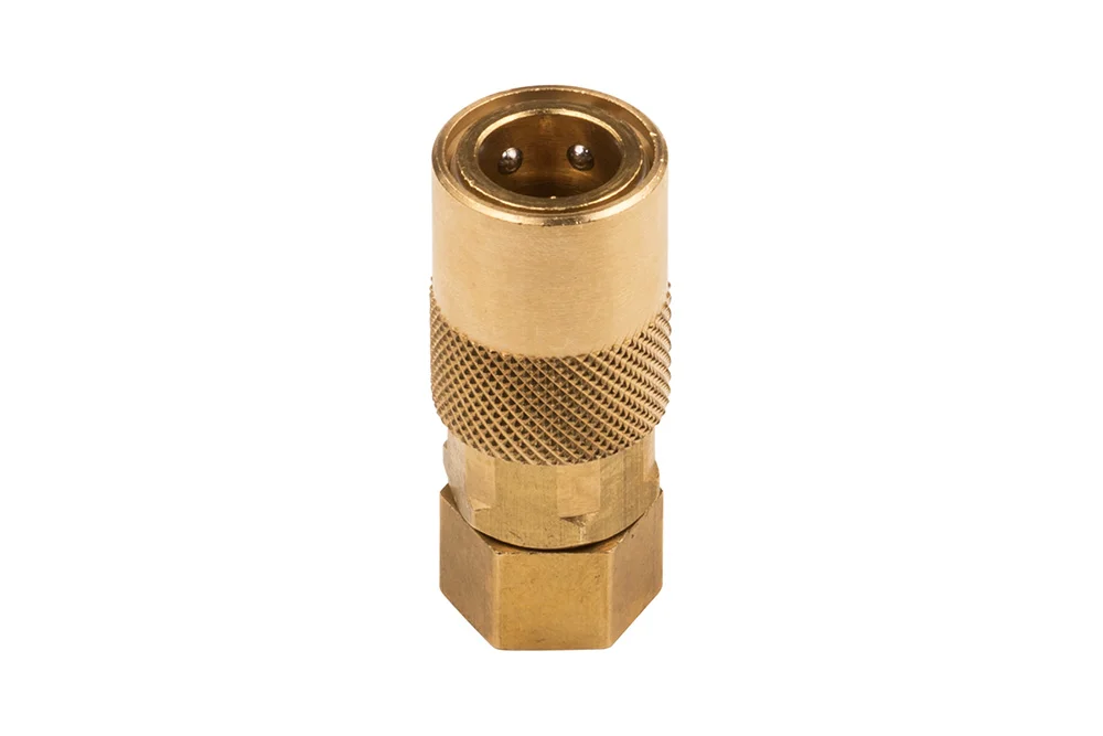 DN 9 quick coupling socket with internal BSP and NPT thread, with or without valve, widely used in the industry for cooling injection molds and casting parts made of plastics, aluminum, brass, and zinc alloys. It can be used for water in cleaning machines, hot oil, and steam. Flow diameter: 9 mm. Working pressure: 15 bar. Operating temperature: from -20°C to +200°C (Viton). Material: brass (socket body, connection, valve sleeve), stainless steel (spring, ring, balls).