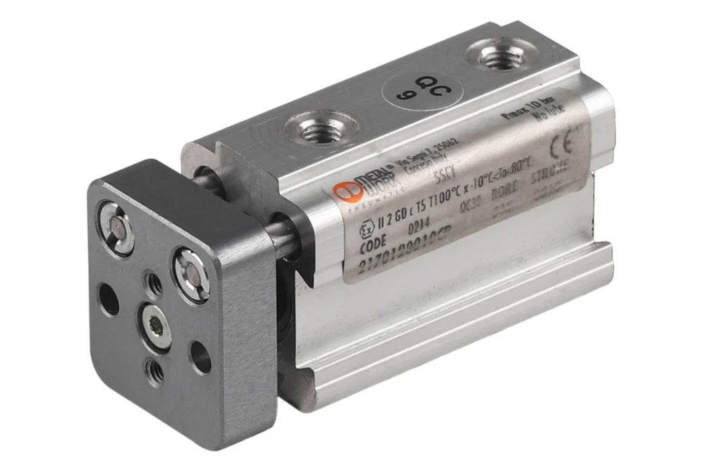 Double-acting short-stroke actuator with rotation protection using a magnet. The SSCY series is characterized by a compact design and is intended for installation in confined spaces. The operational lifespan of actuators without transverse load with NBR seals is 15 million cycles, and with polyurethane seals, it is 30 million cycles. Due to the variability of many factors affecting lifespan, the presented values should not be considered binding or guaranteed, but only as a reference. Available piston diameters: Ø 12 ÷ 80 mm. Working stroke: from 10 to 80 mm. Seal material of the actuator: NBR, polyurethane. Operating pressure: from 0.4 to 10 bar – depending on the piston diameter. Operating temperature: from -10°C to +80°C – depending on the type of seal.
