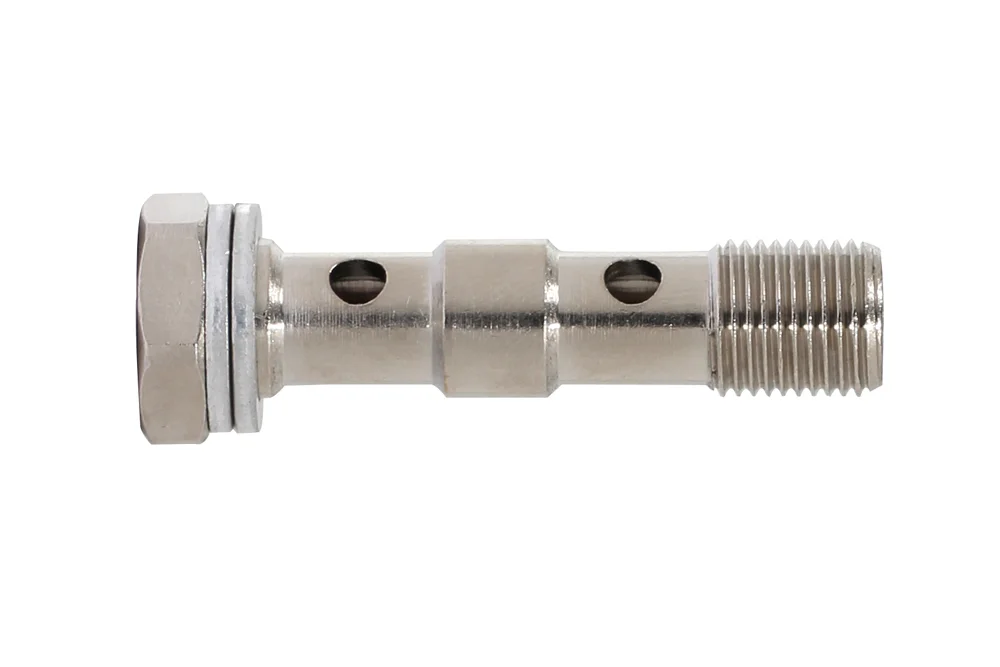 Double BANJO screw with washer type D8 for couplings type R13, R14, D12, D17, D5, D6. Material: nickel-plated brass. Working pressure: 18 bar.