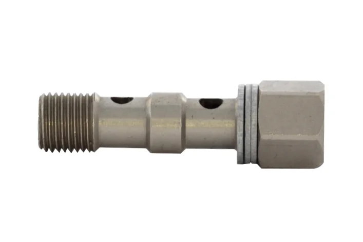 Double BANJO screw with washer and internal thread type D10 for couplings type R13, R14, D12, D17, D5, D6. Material: nickel-plated brass. Working pressure: 18 bar.