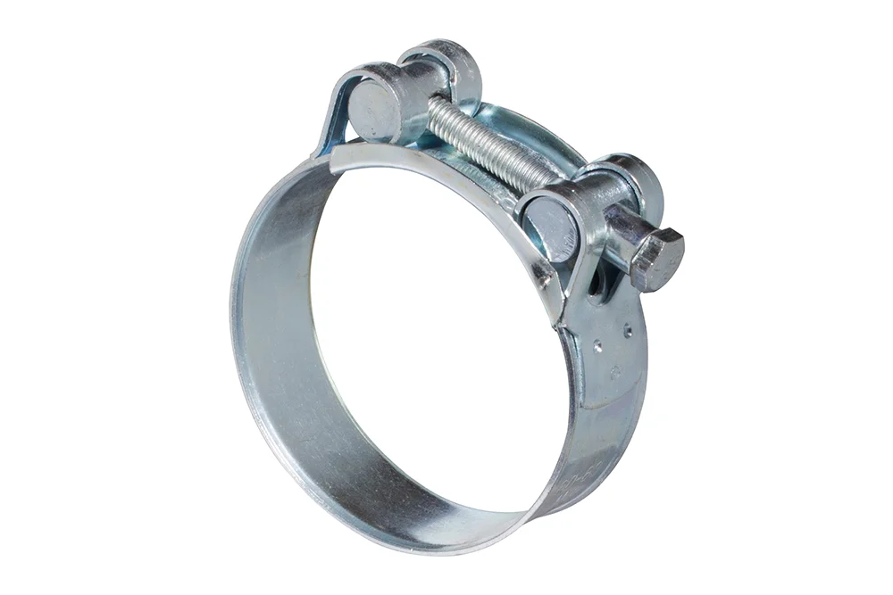 Strong screw clamp with a hinged closure for heavy loads features a durable construction and two full pins. Recommended for tight connections of thick-walled, reinforced industrial hoses. The clamp is made from high-quality steel band with a width ranging from 18 mm to 26 mm. The rolled edges of the band prevent damage to the surface of the hose on which the clamp operates. The clamp has markings on the band indicating the minimum and maximum diameter as well as the material from which it is made. Thanks to the hexagonal head of the screw, commonly used tools such as flat wrenches, socket wrenches, and adjustable wrenches can be utilized. Material: all components made of galvanized steel.