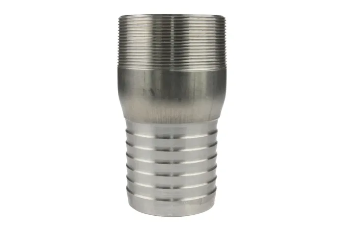 Type CNP end with external tapered BSPT thread made of AISI 316 steel with a “tail” for hose. Designed for rubber and plastic industrial hoses. Installation using straps, clamps, or special CNFL type crimping sleeves. Material: AISI 316 steel.