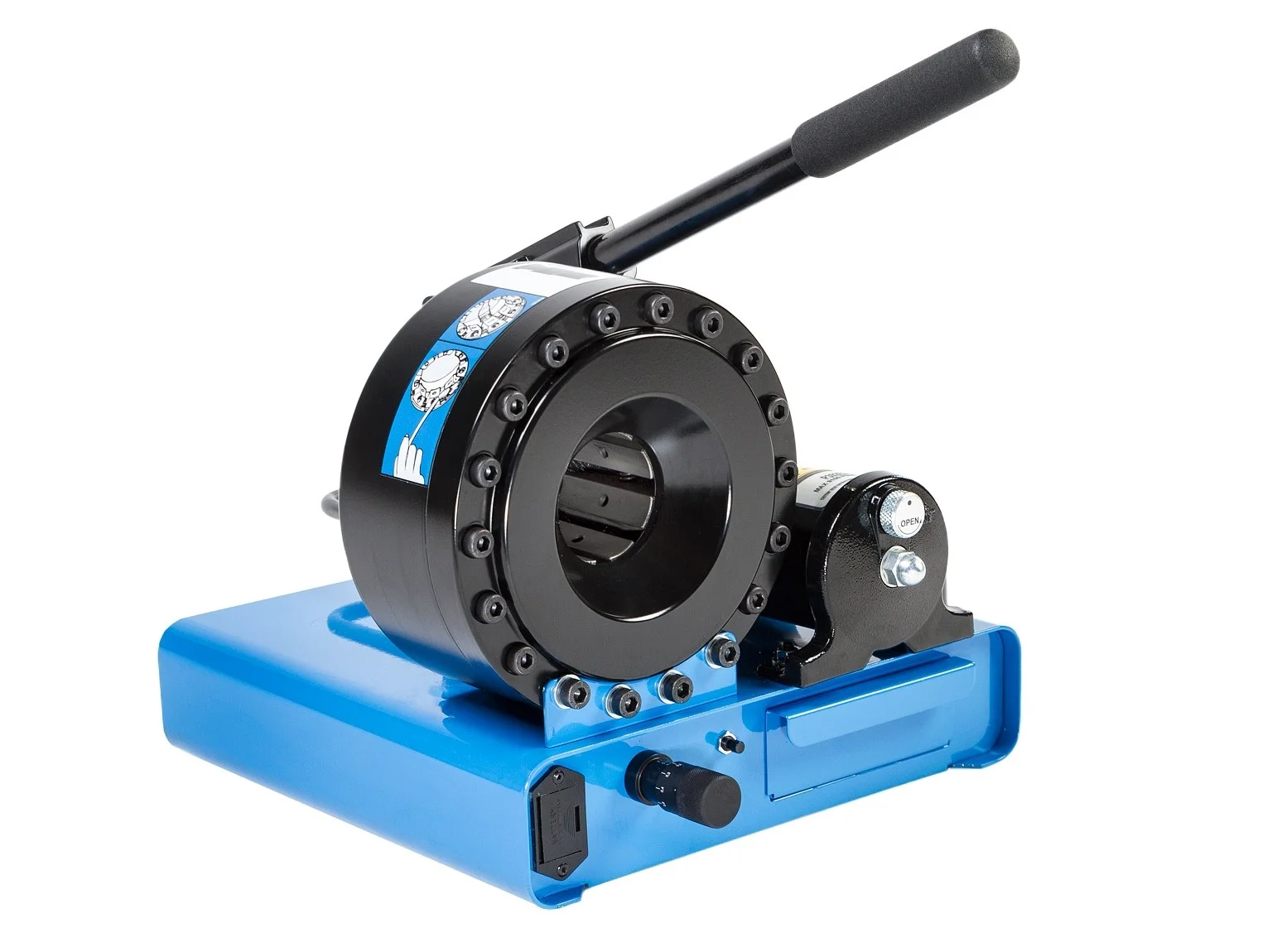 P16 HP press with manual hydraulic pump drive, intended for repair workshops, technical vehicles, service points, etc. Compact design and low weight allow for repairs at the site of failure. Electric (battery-operated) indicator for achieving the crimping diameter. All FINN-POWER crimping presses are designed to work with interchangeable jaw sets (ordered separately). For example, for a crimping diameter range from 10 to 38 mm, 8 sets of standard jaws from FP-16-10 to FP-16-31 should be ordered, with the largest crimping diameter of up to 45 mm achieved using the main jaws.