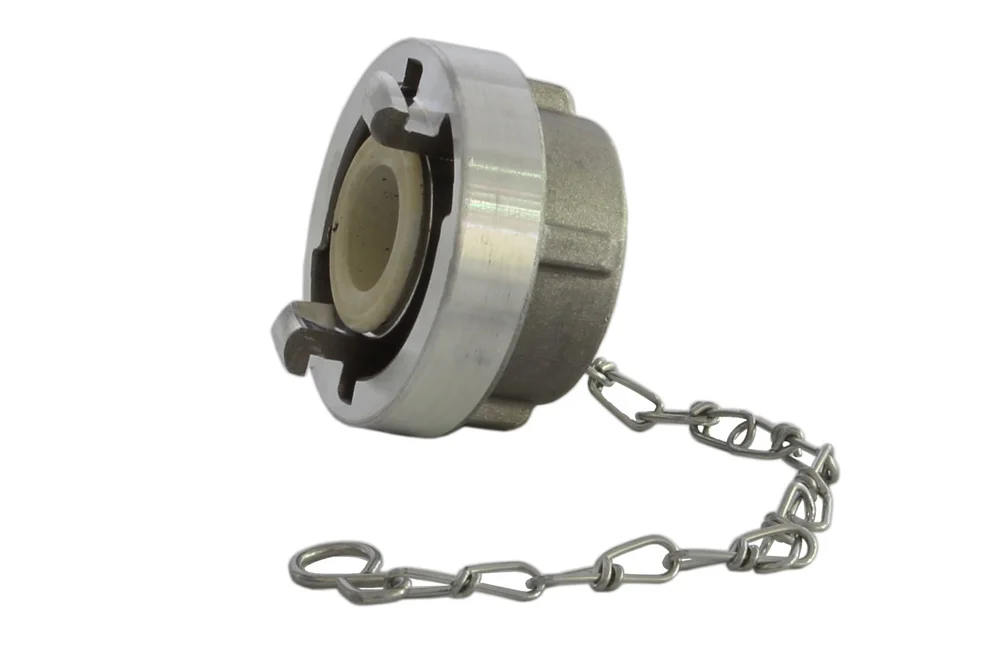 STORZ cap, equipped with a chain to prevent loss, intended for transmission installations for liquid and bulk substances. Used in firefighting, irrigation systems, chemical industry, food industry, agriculture, etc. With a symmetrical design of the connection part, it easily connects with each other. Elements with the same hook spacing can be connected. Available in a forged version with a working pressure of up to 16 bar and in a cast version, characterized by significantly lower strength with a working pressure of up to 6 bar. Material: aluminum. Working pressure: 16 bar (forged connections), 6 bar (cast connections). Seal: white NBR rubber (forged connections), black NBR rubber (cast connections).