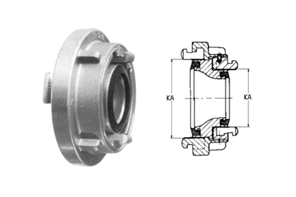 STORZ reducing coupling intended for transmission installations for liquid and bulk substances. Used in firefighting, irrigation systems, chemical industry, food industry, agriculture, etc. Characterized by a large, unobstructed diameter of flow. With a symmetrical design of the connecting part, allowing for easy connection. Elements with the same spacing of hooks can be connected. Material: brass. Working pressure: 16 bar. Seal: black NBR rubber.