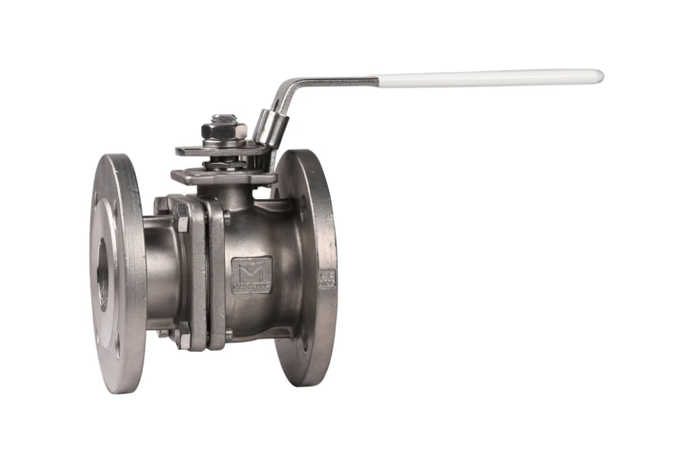 Universal two-part, flanged ball valve type 2019S with full bore, lever lock, and actuator connection according to ISO 5211, intended for industrial installations. It can be used for air, gases, water, steam, chemicals, petrochemical products, etc., considering the chemical resistance of the valve material and sealing. It meets the requirements of the PED directive 2014/68/EU. The working pressure depends on the operating temperature. Body material: stainless steel CF8M. Ball material: stainless steel CF8M. Lever material: stainless steel AISI 304. Ball sealing: PTFE / RTFE. Stem sealing: PTFE. Connection: flange PN16 according to DIN 2501. Operating temperature: from -20°C to +200°C.