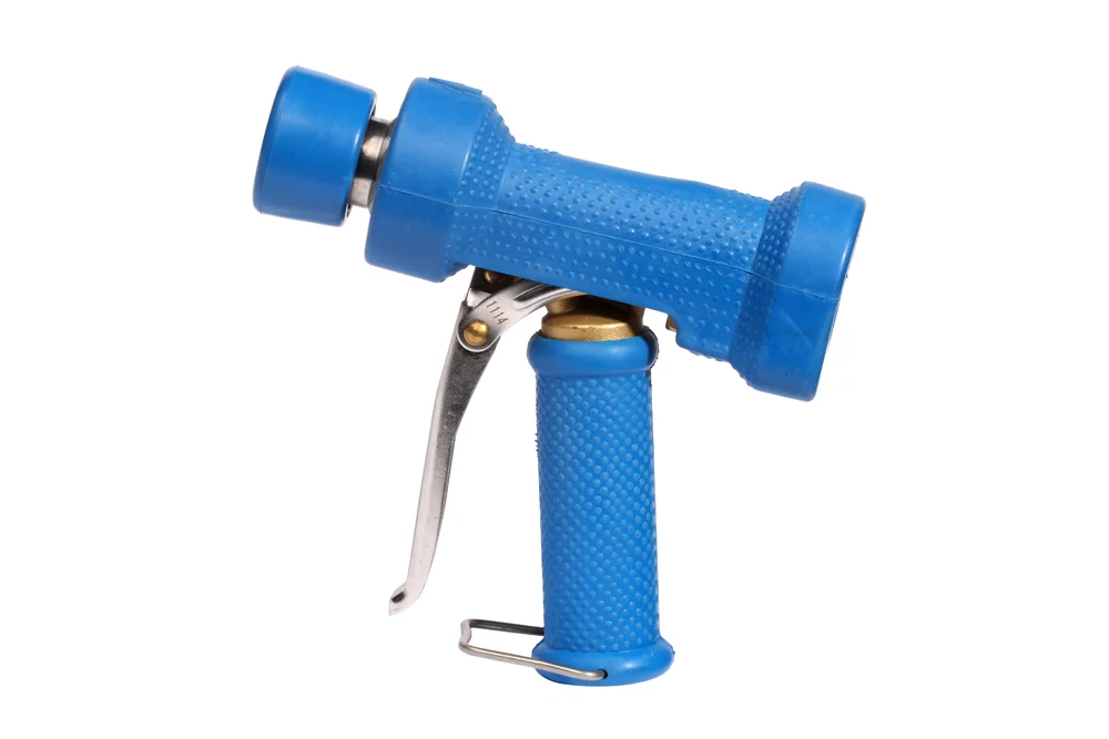 Foam and spraying gun for mounting lances and nozzles (outlet quick coupling DN11.8). Features smooth flow regulation and trigger lock (no insulation on the trigger). Automatic flow shut-off when the trigger is released. Material: brass. Trigger made of stainless steel. Cover made of blue EPDM rubber. Sealing: EPDM. Connection (inlet): 1/2″ BSP female thread. Maximum working pressure: 24 bar. Maximum operating temperature: +95°C.