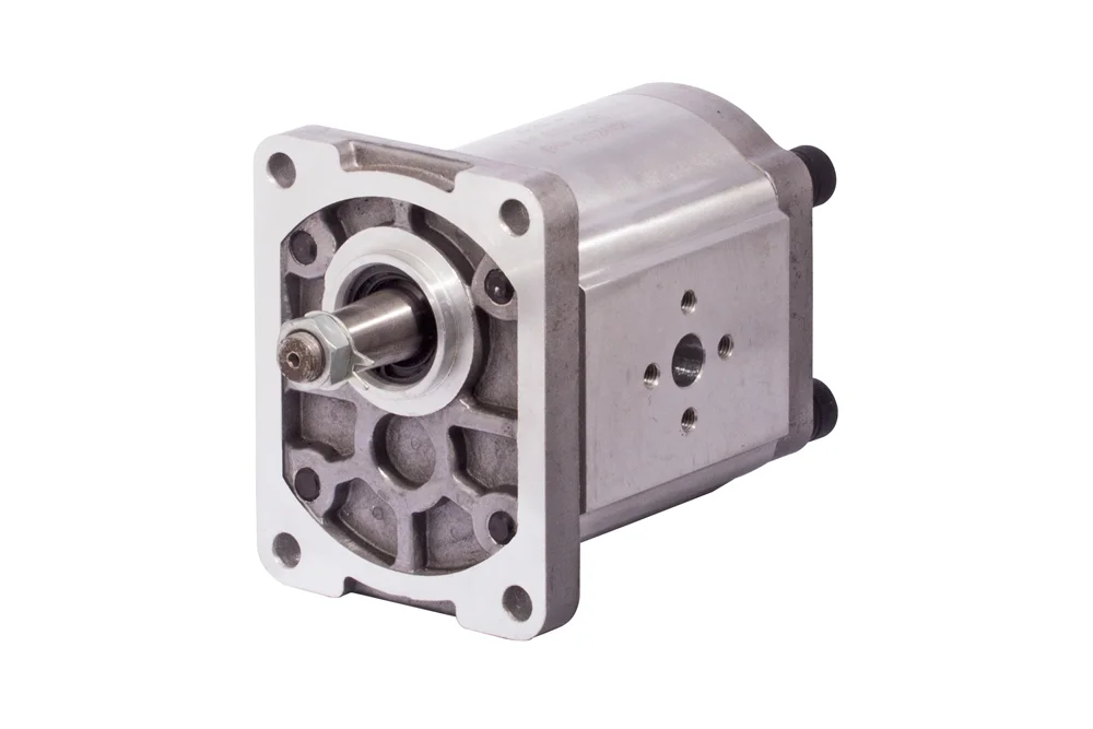 Gear displacement pump (hydraulic), TRALE, with external gearing, intended for use in hydraulic systems of machines and equipment. Connections: flanged. Direction of rotation: left. The stated maximum working pressure applies to continuous operation. Material: body and mounting plate – aluminum, rear cover – aluminum. Sealing: NBR. Medium: hydraulic oil type L-HM45 or equivalent. Liquid viscosity: from 10 cSt to 600 cSt (recommended 30 ÷ 45). Operating temperature: from -20°C to +90°C (medium), from -20°C to +60°C (environment).
