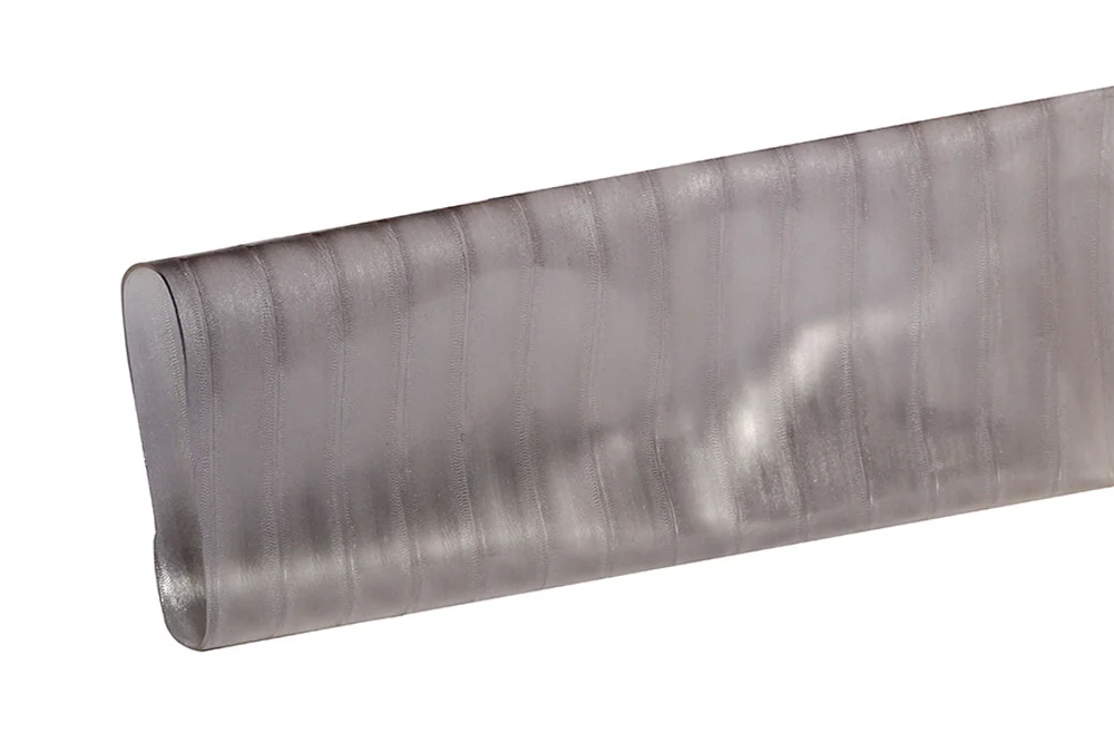 Lightweight, smooth, flat-wound hose designed for the discharge of bulk materials. Particularly used in installations exposed to vibrations and mechanical damage. Suitable for contact with food and in the pharmaceutical industry, being tasteless and odorless, in compliance with FDA requirements (21CFR177.2600). It is not subject to hydrolysis and is resistant to microbes. Also resistant to mineral oils, aging, atmospheric factors, ozone, UV, and many chemicals. Hose material: transparent polyurethane. Working pressure: from 0.135 bar to 1.03 bar, depending on the hose diameter. Operating temperature: -40°C to +90°C (temporarily +125°).