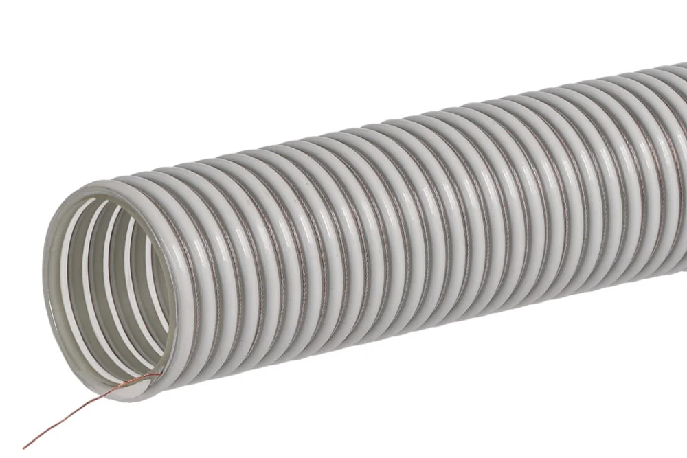 Strong suction hose designed for the transfer of dry or liquid abrasive substances, granules, etc. Externally corrugated, internally smooth. The inner layer is made of transparent, abrasion-resistant polyurethane. The hose features a copper wire arranged in a spiral, which discharges electric charges when grounded or connected to a fitting. Widely used in plastic processing in applications requiring greater resistance to abrasion, puncturing, and cutting of the hose. Particularly recommended for plastic regrind with relatively sharp edges. Inner layer: transparent polyurethane. Reinforcement: hard PVC spiral. Hose material: transparent PVC. Working pressure: from 3 bar to 7 bar – depending on the hose diameter and temperature. Vacuum: from 0.69 bar to 0.74 bar – depending on the hose diameter and temperature. Operating temperature: from -5°C to +60°C.