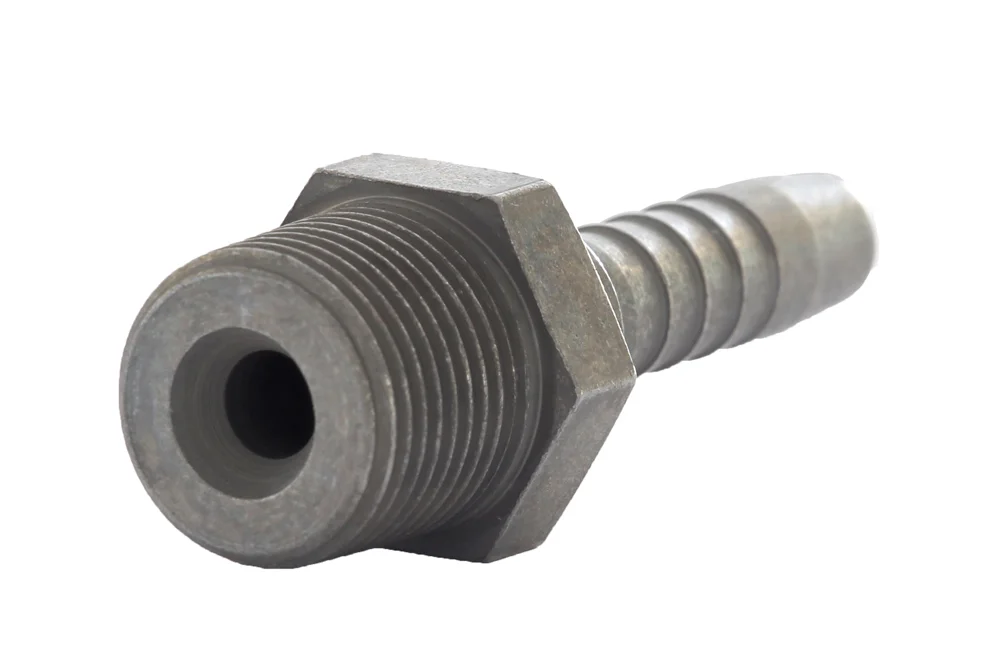 Standard hydraulic end (type Z – with a regular hydraulic “tail” for the hose), with external BSPT thread, sealing on the thread using Teflon tape or liquid sealant; possible sealing on a 60° cone (AGR-K). Designed for crimping in hydraulic and industrial hoses using a crimping sleeve suitable for the hose type. Surface coated with zinc-nickel with a layer thickness of 6-10 µm, which is characterized by very high corrosion resistance (up to 720 hours without corrosion in a salt chamber). Material: carbon steel, zinc-nickel.