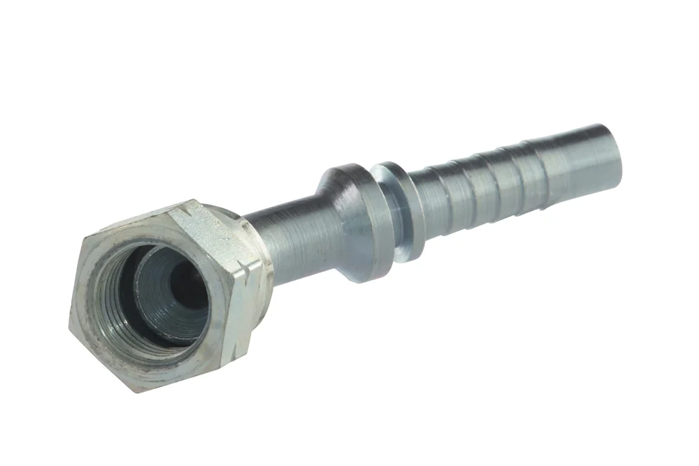 Standard hydraulic end (type Z – with a regular hydraulic “tail” for hose), with internal UNF thread and nut, sealing on a 74° cone (DKJ), angled 45°. Designed for crimping in hydraulic and industrial hoses using a crimping sleeve suitable for the hose type. Material: carbon steel, galvanized.