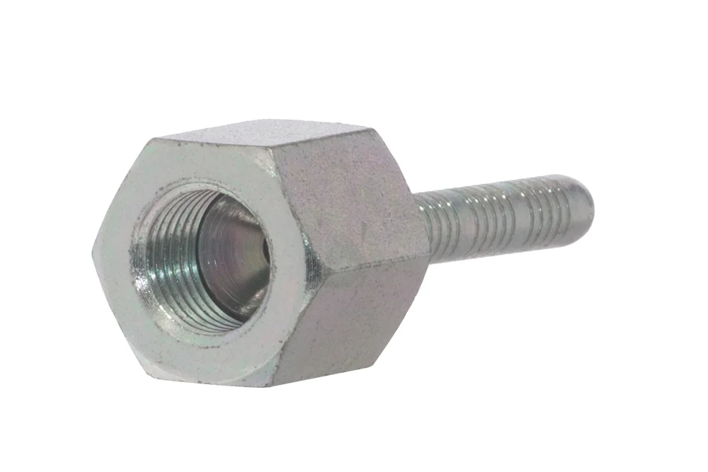Hydraulic end fitting (type P – with a special “tail” for thermoplastic hose) with internal UNF thread, sealing on a 74° cone (DKJ). Designed for crimping in UHP thermoplastic hoses using a crimping sleeve suitable for the hose type. Material: carbon steel, galvanized.