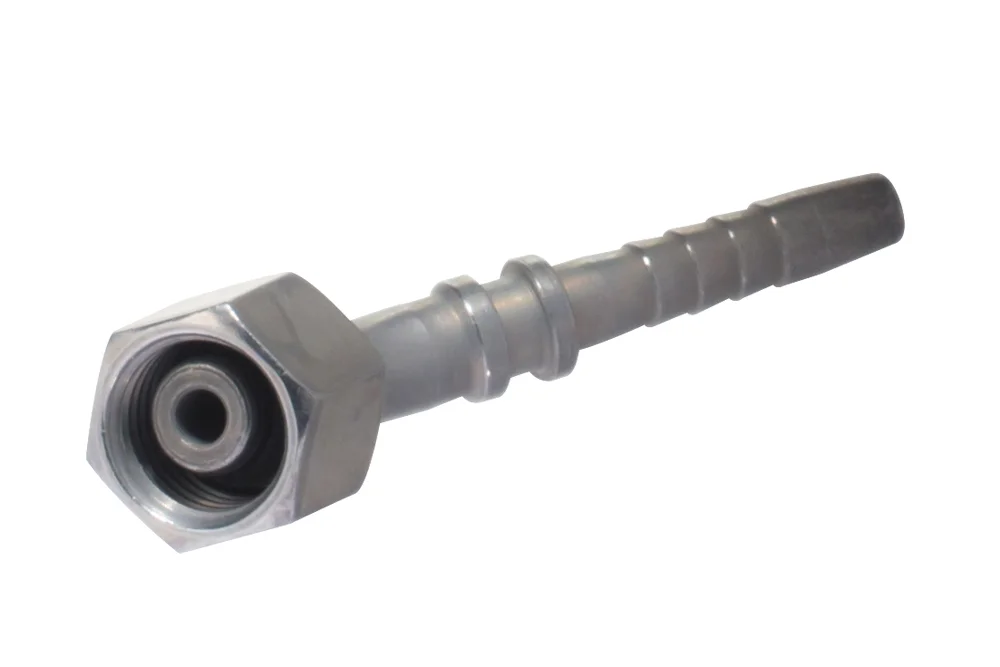 Standard hydraulic end fitting (type Z – with a regular hydraulic “tail” for hose), with internal metric thread and nut, sealing with an O-ring on a 24° cone (DKOL), angled 45°, lightweight series. Designed for crimping in hydraulic and industrial hoses using a crimping sleeve suitable for the hose type. Surface coated with zinc-nickel with a layer thickness of 6-10 µm, which exhibits very high corrosion resistance (up to 720 hours without corrosion in a salt spray chamber). Material: carbon steel, zinc-nickel.