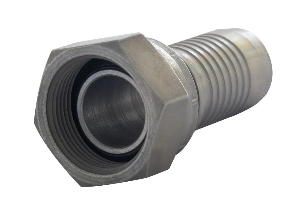 Standard hydraulic end (type Z – with a regular hydraulic “tail” for the hose), with internal BSP thread and nut, sealing with an O-ring on a 60° cone (DKOR). Designed for crimping in hydraulic and industrial hoses using a crimping sleeve suitable for the hose type. Surface coated with zinc-nickel with a thickness of 6-10 µm, which exhibits very high corrosion resistance (up to 720 hours without corrosion in a salt spray chamber). Material: carbon steel, zinc-nickel.