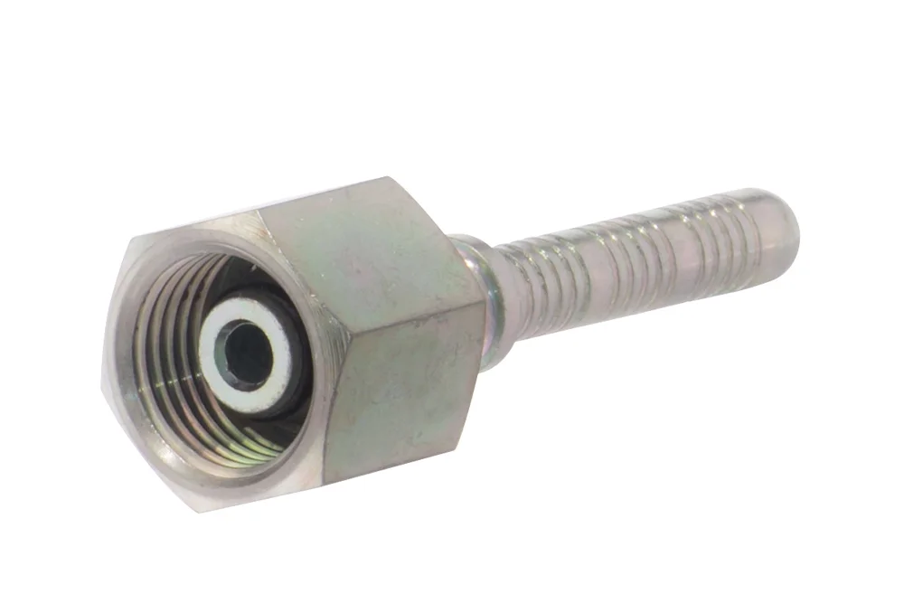 Hydraulic end fitting (type P – with a special “tail” for thermoplastic hose) with internal metric thread, sealing with an O-ring on a 24° cone (DKOS), heavy-duty series. Designed for crimping in UHP thermoplastic hoses using a crimping sleeve suitable for the hose type. Material: carbon steel, galvanized.