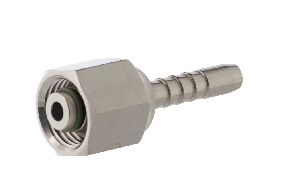 Standard hydraulic end (type Z – with a regular hydraulic “tail” for hose), with internal metric thread and nut, sealing with O-ring on a 24° cone (DKOS), heavy-duty series. Designed for crimping in hydraulic and industrial hoses using a crimping sleeve suitable for the hose type. Material: AISI 316L steel.