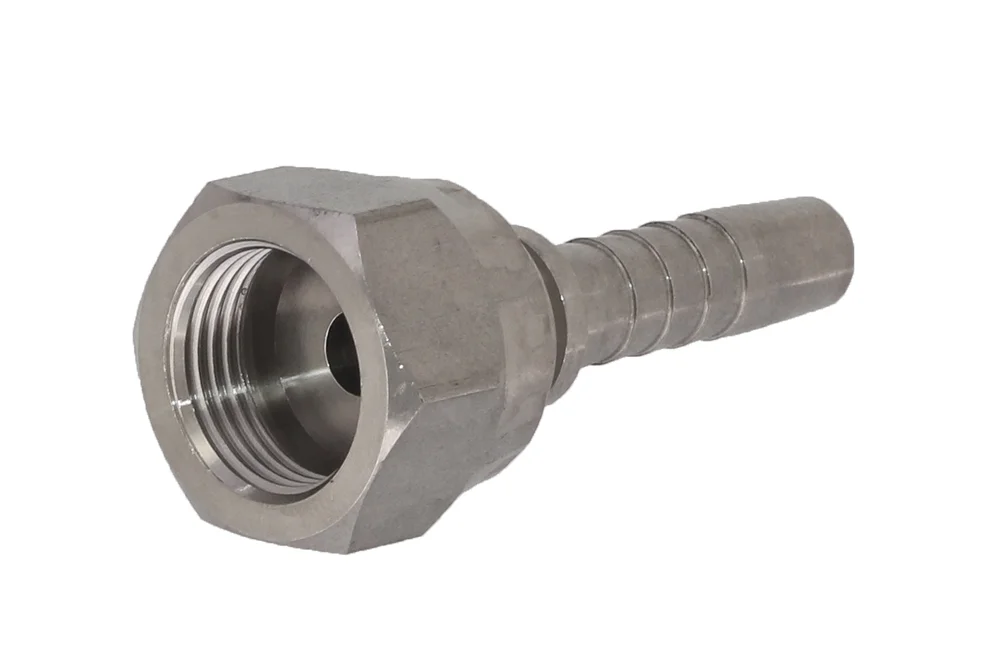 Standard hydraulic end fitting (type Z – with a regular hydraulic “tail” for the hose), with internal BSP thread and nut, flat sealing – requires the use of an additional flat gasket (DKR-F). Designed for crimping in hydraulic and industrial hoses using a crimping sleeve suitable for the type of hose (use sleeves marked additionally with the letters “-PH” at the end of the index). Material: AISI 316 steel.