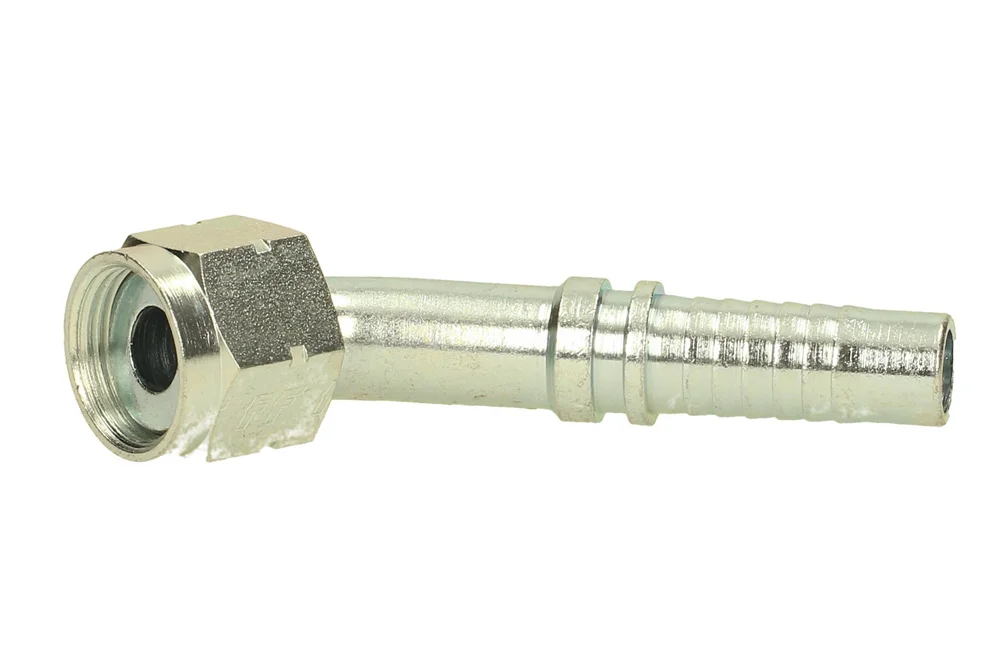 Standard hydraulic end (type Z – with a regular hydraulic “tail” for hose), with internal UNF thread and nut, flat sealing (ORFS), 45° angle. Designed for crimping in hydraulic and industrial hoses using a crimping sleeve suitable for the hose type. Material: carbon steel, galvanized.