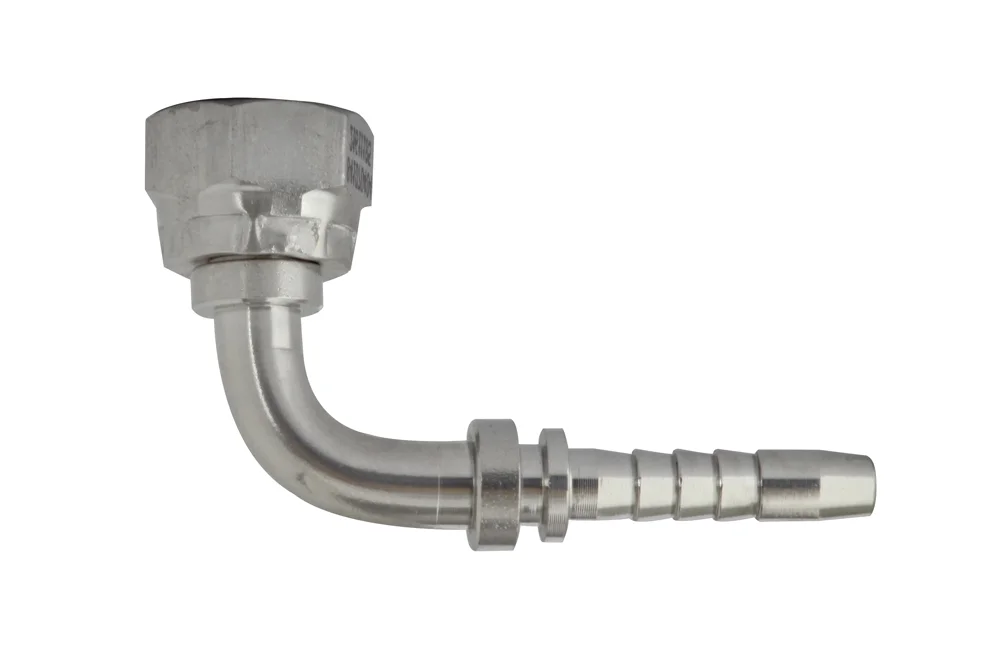 Standard hydraulic end (type Z – with a regular hydraulic “tail” for hose), with internal BSP thread and nut, sealing cone 60° (DKR), angled 90°. Designed for crimping in hydraulic and industrial hoses using a crimping sleeve suitable for the type of hose (use sleeves marked additionally with the letters “-PH” at the end of the index). Material: AISI 316 steel.