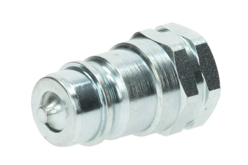 ISO-A hydraulic quick coupling with shut-off valve and internal metric thread. Application: power hydraulics (hydraulic oil). The quick coupling is mainly used in agricultural machinery. Commonly referred to as “euro couplings.” Interchangeable with ISO-A quick couplings from other manufacturers. Material: galvanized steel. Seal of the coupling: NBR. Operating temperature: from -25°C to +100°C. Working pressure: 250 bar. Safety factor 4:1. Flow rate is given at Δp = 3 bar [l/min].