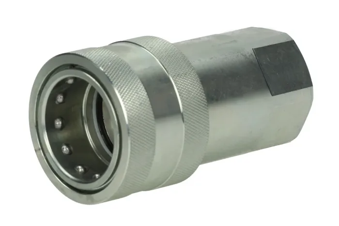 ISO-A hydraulic quick coupling socket with shut-off valve and internal BSP thread. Application: power hydraulics (hydraulic oil). The quick coupling is mainly used in agricultural machinery. Commonly referred to as “euro couplings.” Interchangeable with ISO-A quick couplings from other manufacturers. Material: galvanized steel. Socket sealing: NBR. Operating temperature: from -20°C to +100°C. Working pressure: up to 350 bar (depending on the size of the quick coupling). Safety factor 4:1. Flow is specified for a pressure drop of 3 bar.