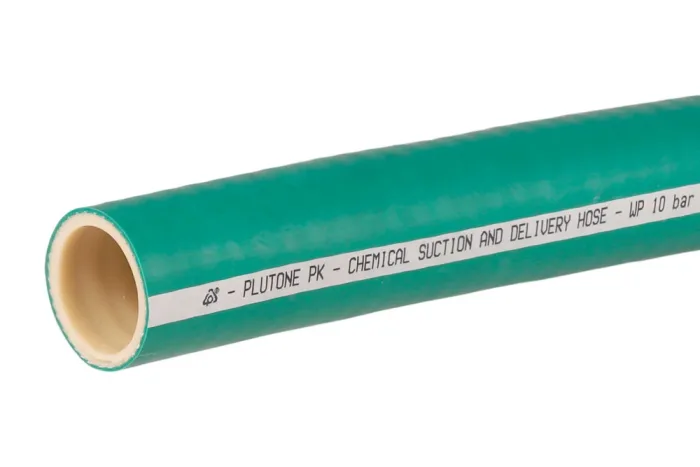 Very lightweight, flexible suction and discharge hose designed for the transfer of chemical substances. Made from thermoplastic vulcanizate TPV – a material that combines the processing advantages of thermoplastic polymers (PP – polypropylene) with the properties of vulcanized rubber (EPDM). Good chemical resistance – similar to EPDM rubber allows for use with many substances, including acids (hydrochloric, sulfuric), bases, salts, alcohols, glycols, and ketones, concentrated detergents. Not recommended for fuels, oils, aromatic solvents. Resistant to weather conditions, aging, and ozone. Low weight and small bending radius of the hose ensure ease of handling, which can be an advantage when transferring from tankers and containers. Note: All hose sizes have branding indicating approximate working pressure (WP 10 bar). Confirmation of resistance and application conditions requires contact with Tubes International. Inner layer: thermoplastic rubber TPV. Reinforcement: polyester braid, steel spiral. Outer layer: thermoplastic rubber TPV. Working pressure for temperature +23°C: from 12 to 14 bar – depending on hose diameter. Operating temperature: from -30°C to +80°C (working pressure dependent on temperature).