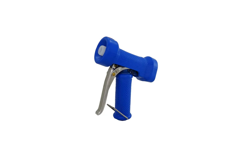 Lightweight foam and spraying gun for mounting lances and nozzles (outlet GZ 1/2″ BSP) made of reinforced fiberglass polyamide PA66. Material: polyamide PA66. Trigger, spring, and valve stem made of stainless steel. Cover made of blue EPDM rubber. Sealing: EPDM. Connection (inlet): G 1/2″ BSP. Maximum working pressure: 12 bar. Maximum operating temperature: +50°C.